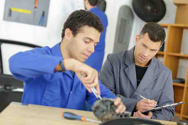 Teacher assessing student working on mechanical part
